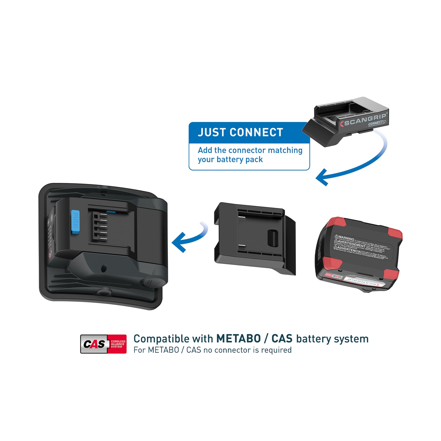 • Compatible with METABO / CAS battery system and all other 18 V/20 V battery packs by using SCANGRIP CONNECTOR